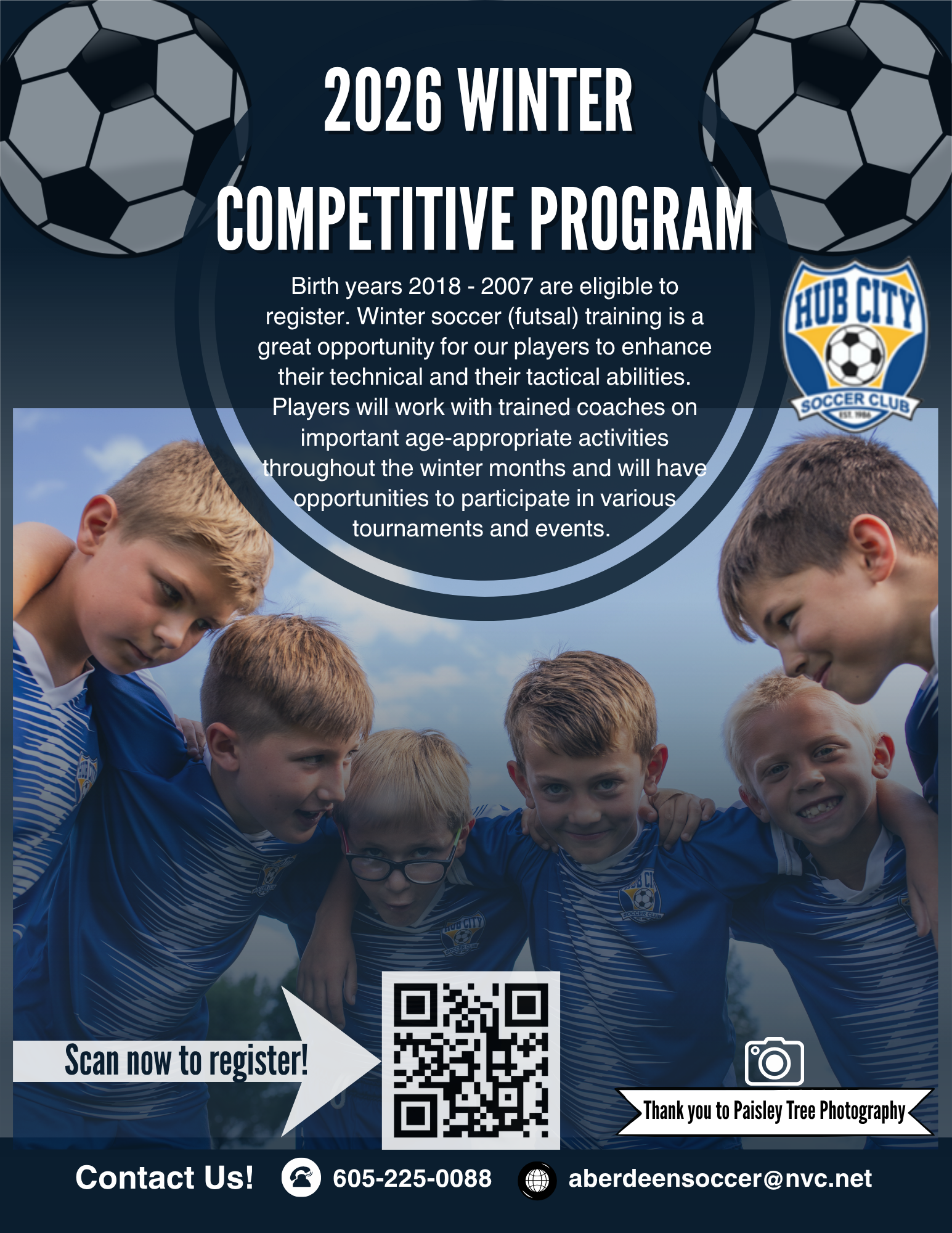 Our 2026 Winter Competitive soccer program has been developed and is ready to go. This winter we will provide training -and competitive tournament opportunities for all players in our U8 through U19 age groups. If a player’s birth year is 2018 through 2007 a player is eligible to play. Winter soccer (futsal) training is a great opportunity for our players to enhance their technical and their tactical abilities. Players will work with trained coaches on important age-appropriate activities throughout the winter months and will have opportunities to participate in various tournaments and events. At the conclusion of the Winter season, players will receive a written evaluation form from their age group coach noting their strengths and areas of potential improvement.